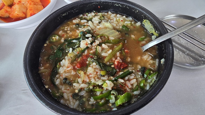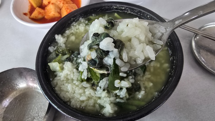 ✅푸짐한 건더기: 올갱이 해장국 안에 휘저으면 올갱이가 제법 많이 들어있어 씹는 맛이 좋고, 아욱, 부추 등 다양한 채소와 함께 끓여 영양도 풍부합니다.