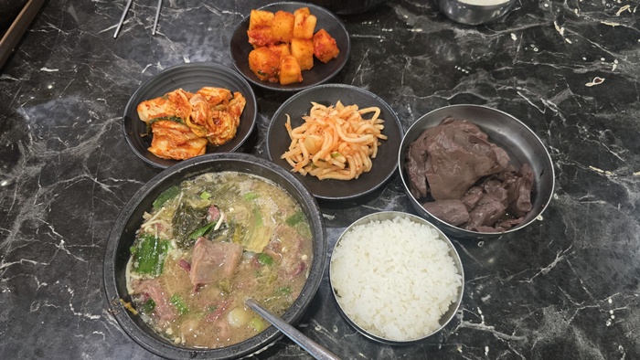 ✅맑고 시원한 소머리 해장국: 유치회관 해장국은 비교적 순하고 맑은 스타일의 국물로, 주로 소머리로 육수를 내어 진득하면서도 깔끔한 맛을 냅니다. 제주도 해장국처럼 자극적이지 않고 심심한 맛이 특징이며, 소고기 육수 특유의 깊은 맛을 느낄 수 있습니다. 갈비탕과 국밥의 장점을 잘 섞은 맛이라는 평도 있습니다.