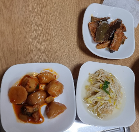 기본으로 나오는 찬입니다. 다 드시고 모자라면 반찬 추가하는 곳에서 가져다 드시면 됩니다.