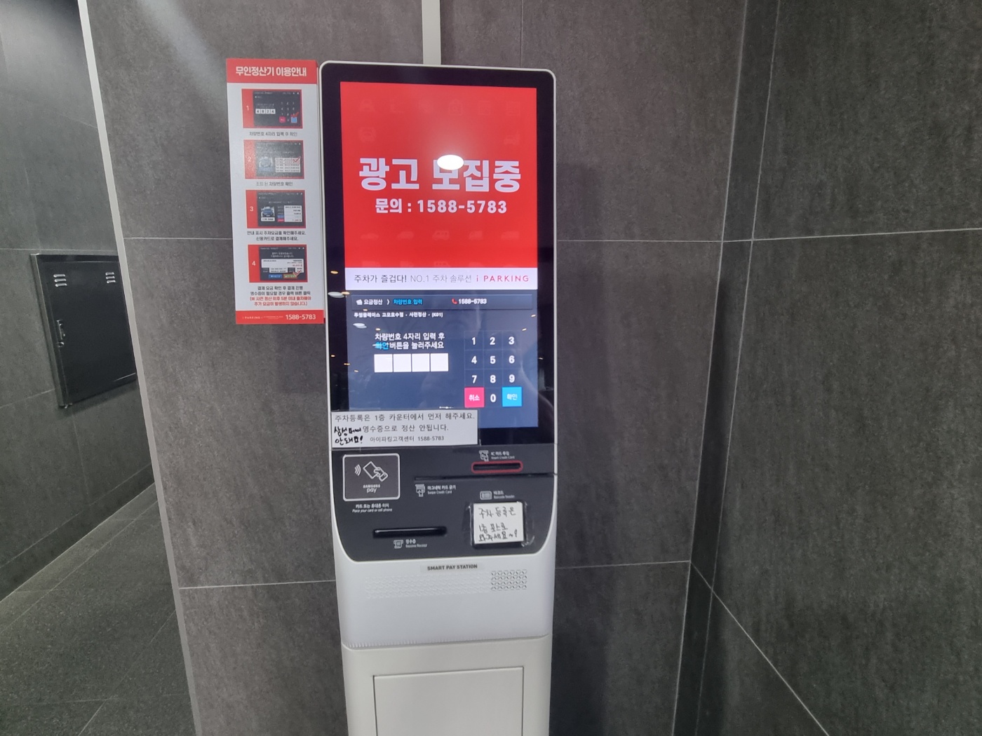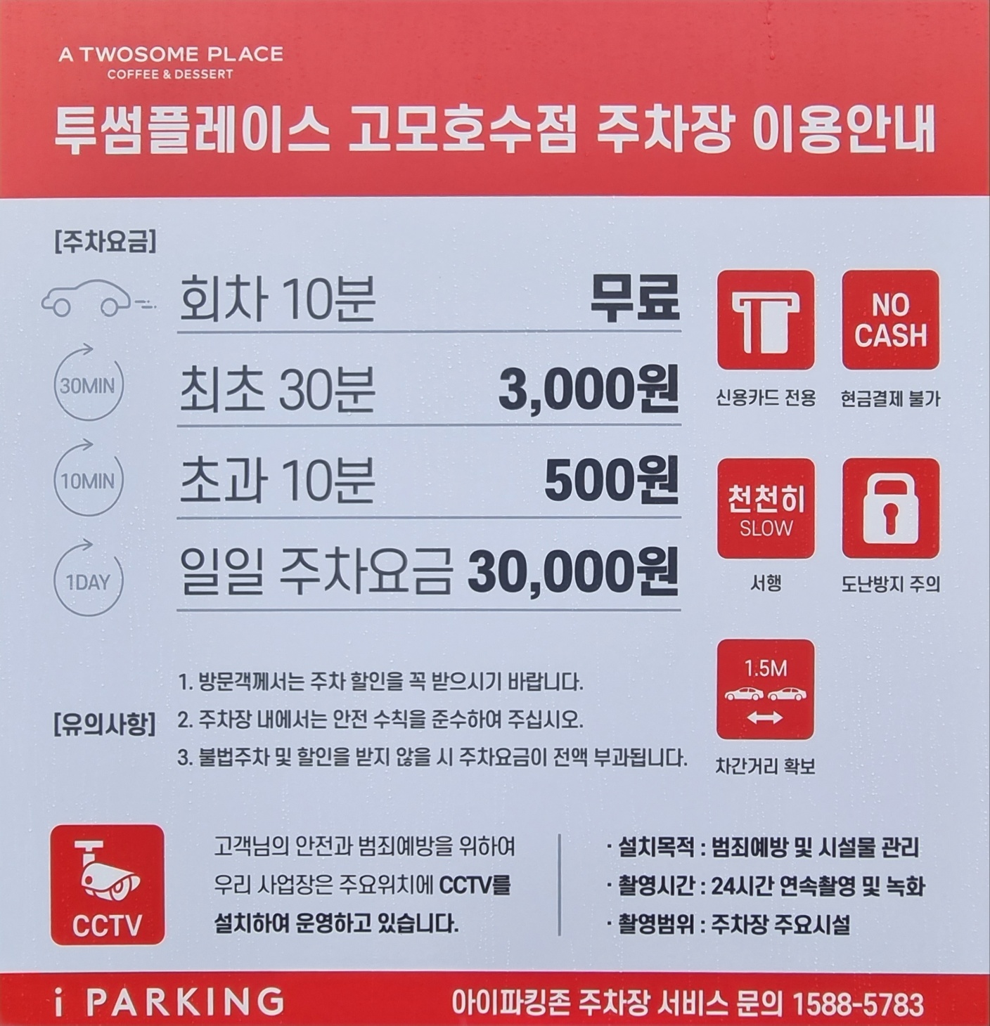 투썸플레이스 고모호수점 주차장 이용안내가 이렇게 벽면에 붙어 있어요. 그리고 주차요금정산하는 키오스크는 현재 쓰지 않고 1층 카운터에서 먼저 정산하라고 쓰여 있고 영수증으로 정산이 안되니 이용에 참고하시기를 바랍니다.
