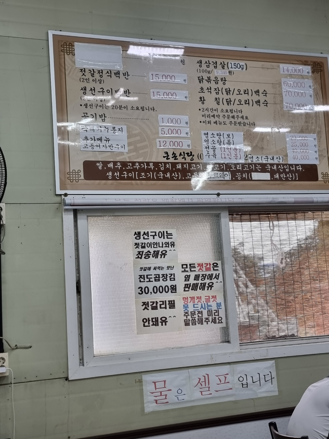 차림표가 세월을 말해주는지 덕지덕지하니 좀 지저분하게 느껴져 별로 좋지 않은 것 같아요. 저만 그런지 모르겠지만 말입니다. 음식점이니 좀 깨끗하게 정리 좀 해서 보는 이 들도 편안하게 볼 수 있고 이미지도 좋은 것 같은데 말입니다. 그리고 생선구이에는 젓갈이 안 나온다고 쓰여 있어요.