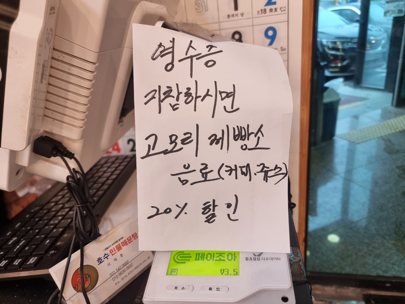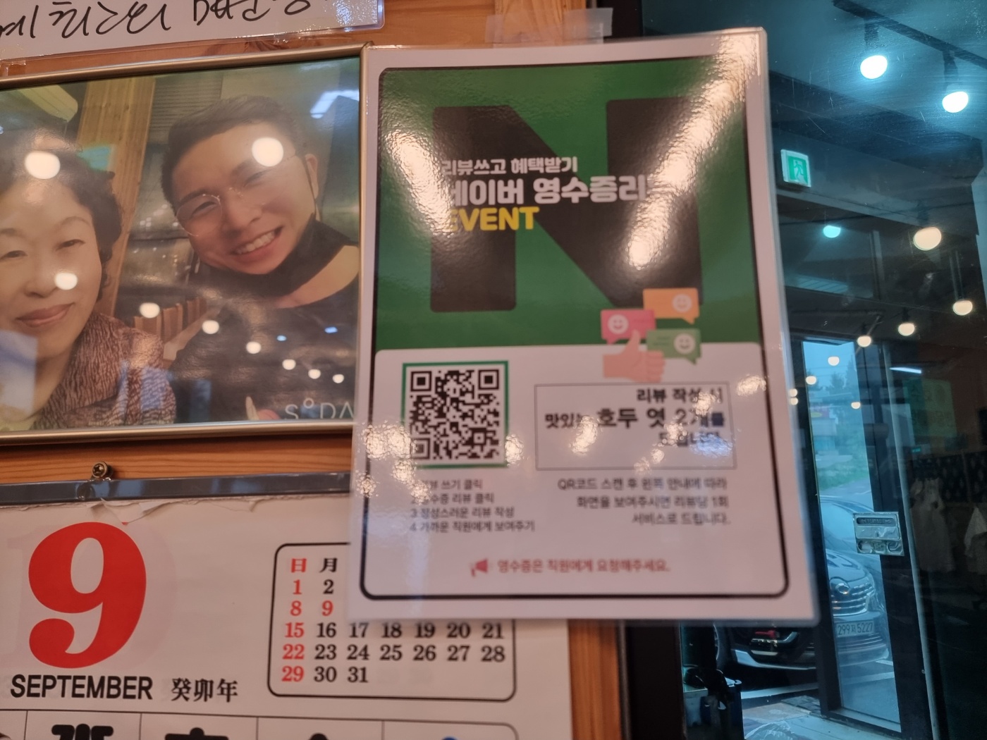 리뷰작성 시 맛있는 호두엿 2개를 드린다고 쓰여 있어요.그리고 영수증을 지참하시고 근처 옆에 있는 고모리제빵소엘 가면 음료(커피,쥬스)가 20%할인된다고 씌여 있어요.
