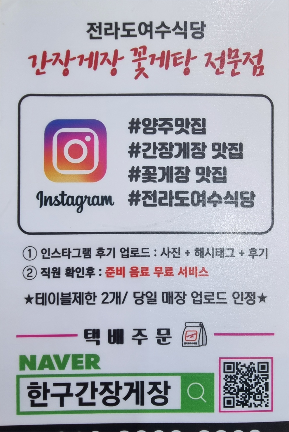 전라도 여수식당 " 간장게장,꽃게탕전문점 "으로 인스타그램 업로드하시면 직원확인 후 음료수가 무료서비스 됩니다.