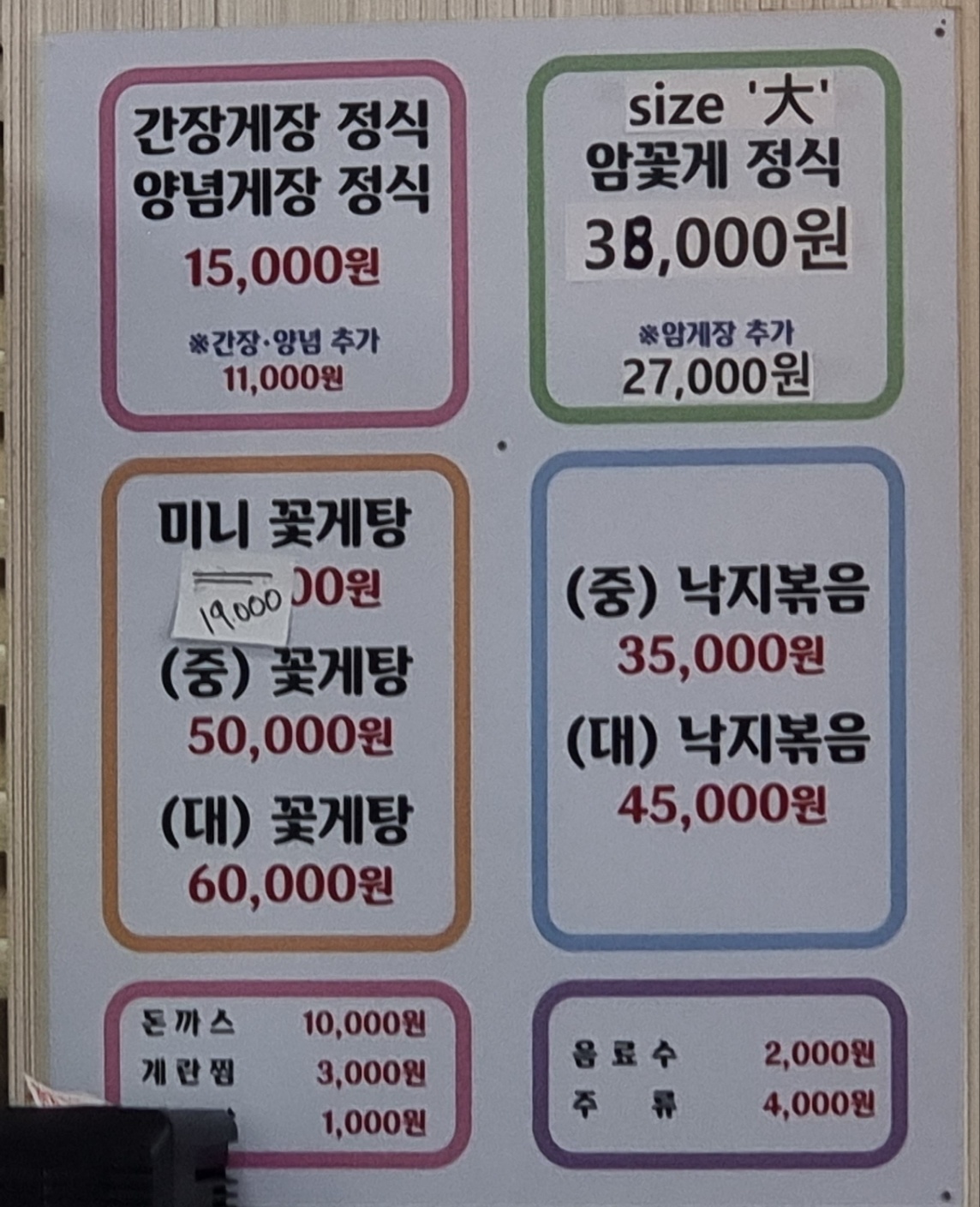 차림표도 있는데 미니 꽃게탕만 가격이 바뀌었나봐요. 그리고 위생장갑, 앞치마, 물수건, 추가반찬 모두가 셀프입니다.