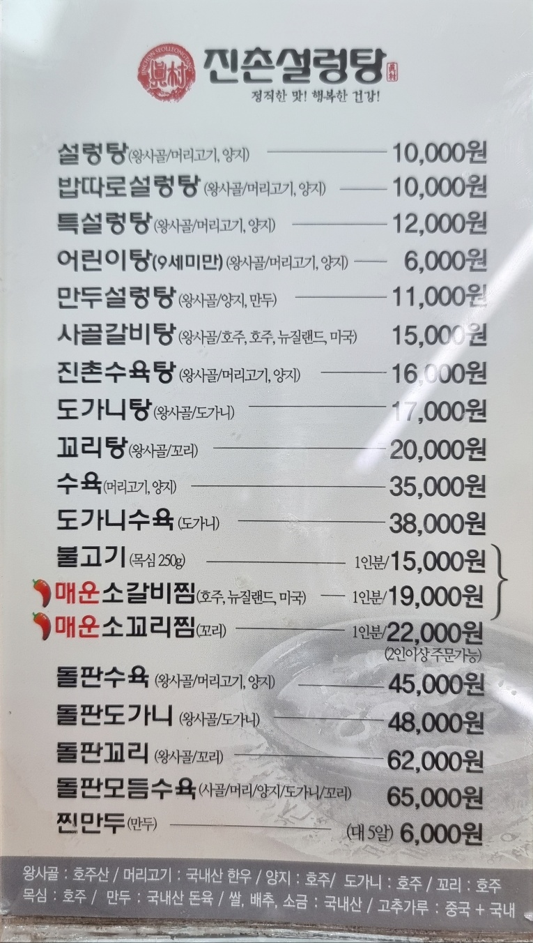 정직한 맛 행복한 건강 진촌설렁탕 본점의 음식 이미지사진과 차림표의 모습입니다.