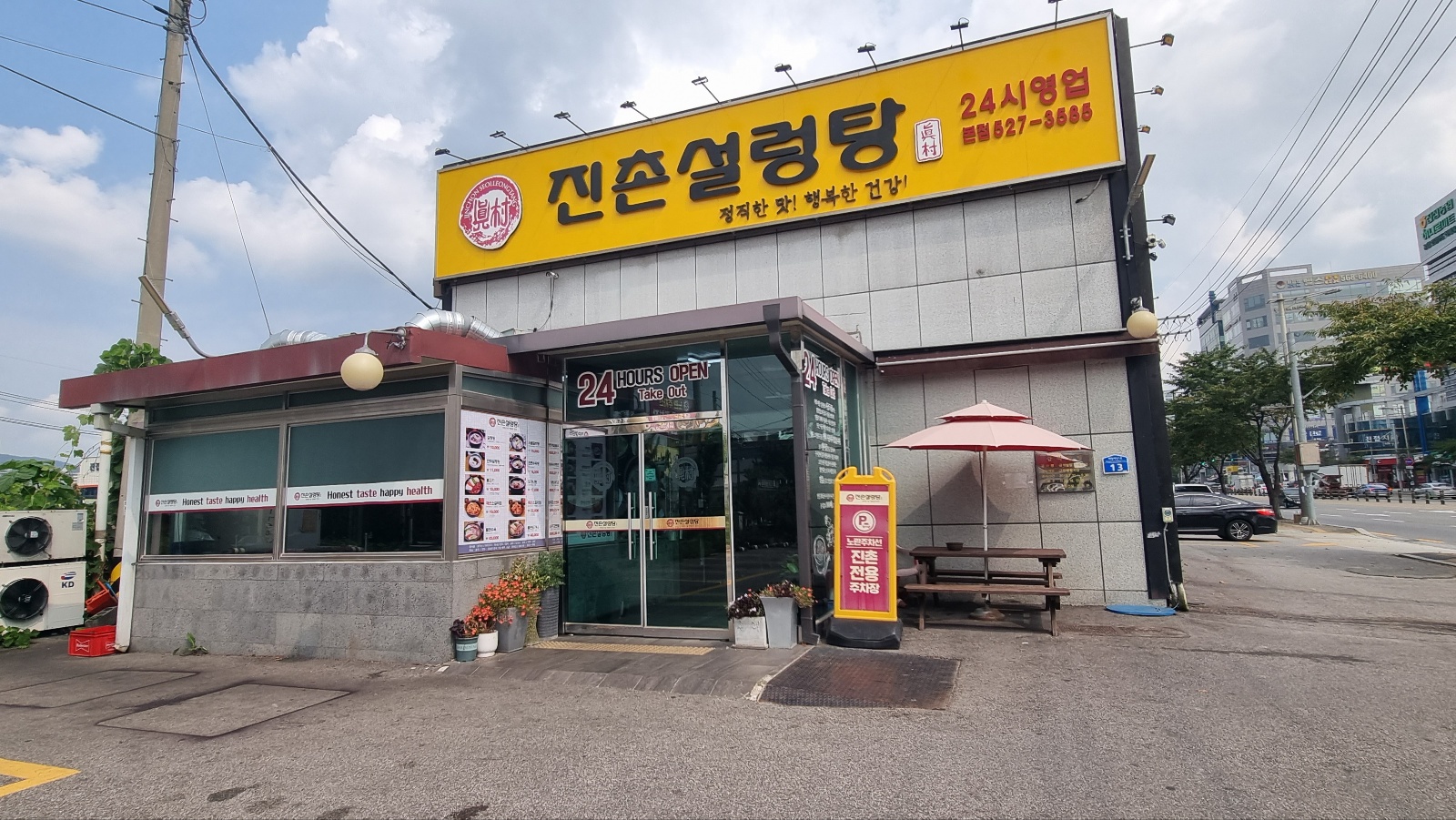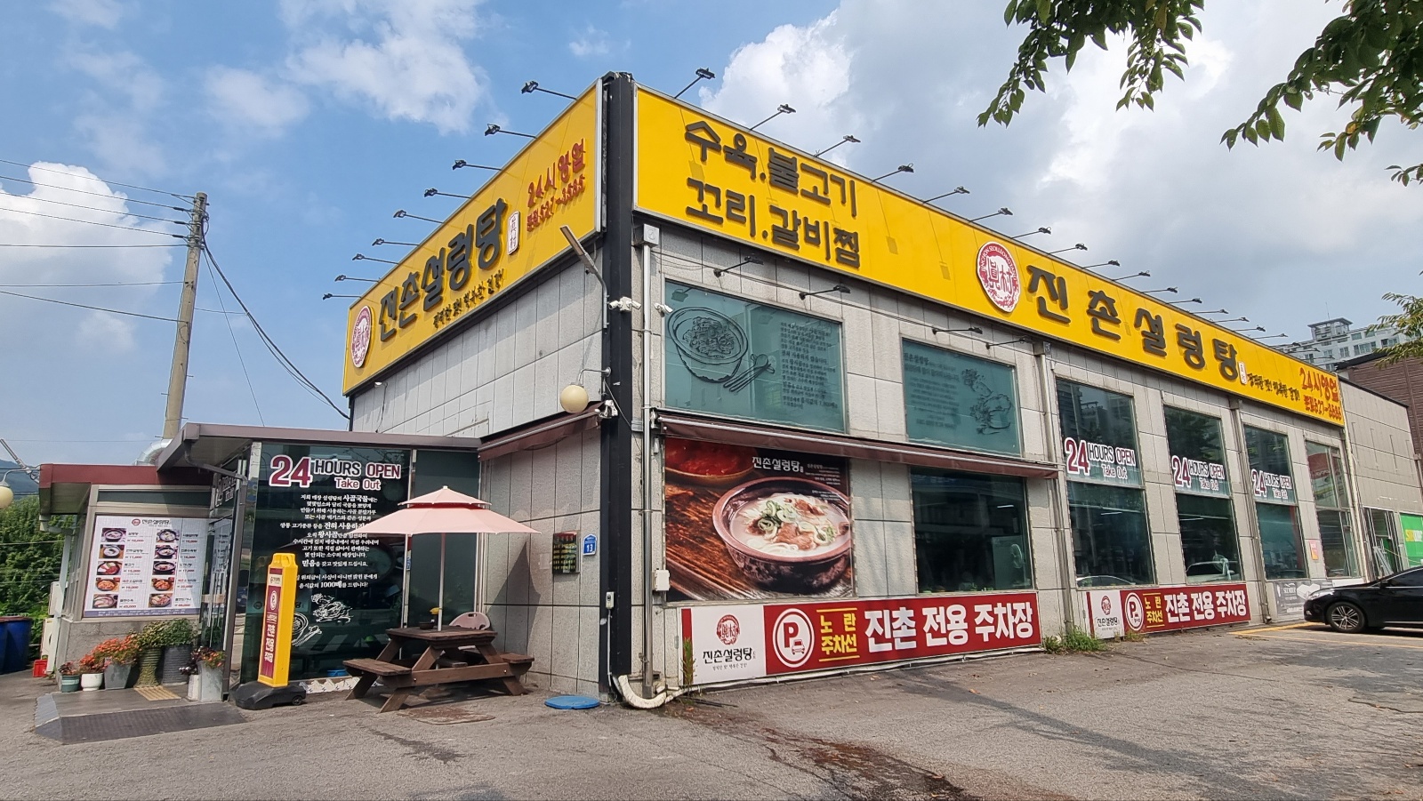 진촌설렁탕 24시 영업 정직한 맛! 행복한 건강! 을 슬로건으로 내걸고 영업을 하는 진촌설렁탕 본점 모습입니다.