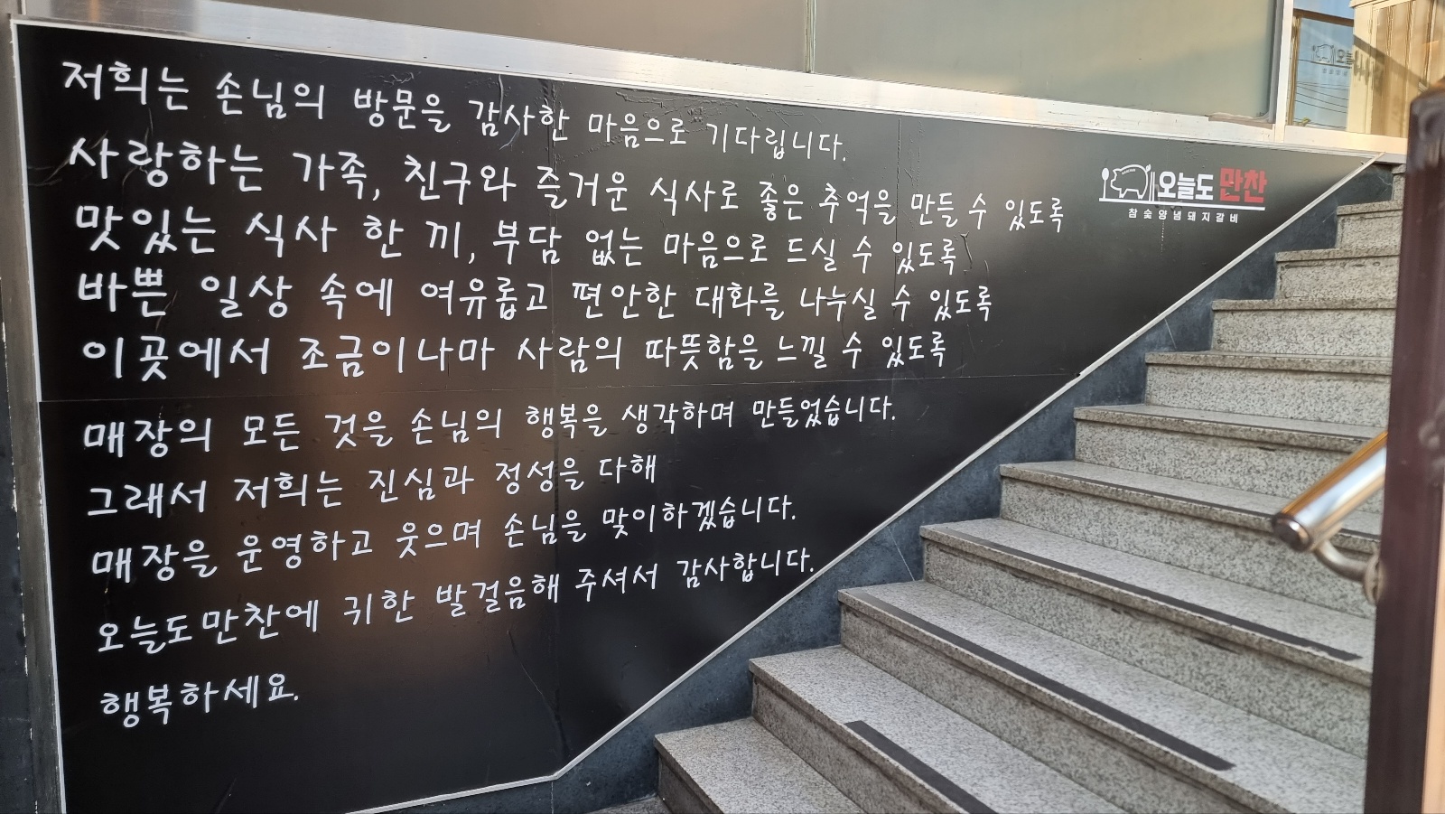 도로에서 계단으로 오르다 보면 이렇게 직원들의 다짐이 있어 믿음이 가고 식당 안으로 들어가면 이렇게 넓은 홀이 나오는데 단체로 많이 오셔도 충분할 겁니다.