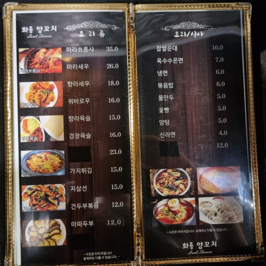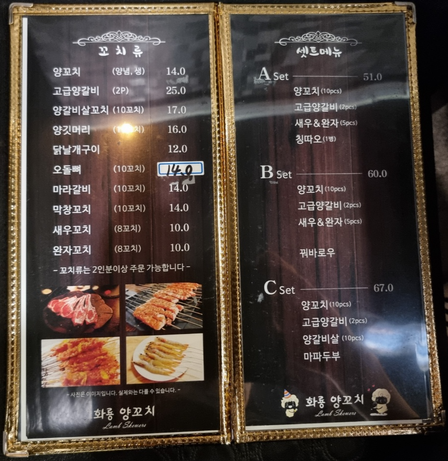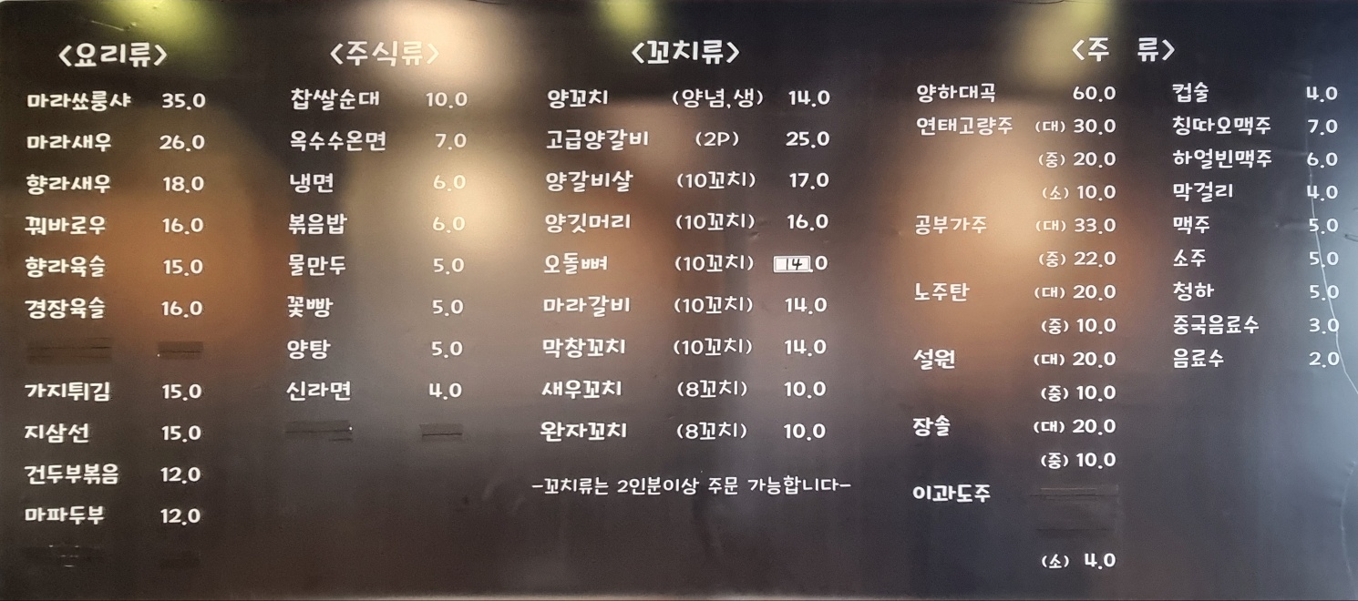 화룡양꼬치의 차림표입니다. 식성에 따라 골라 드시면 되겠지요.