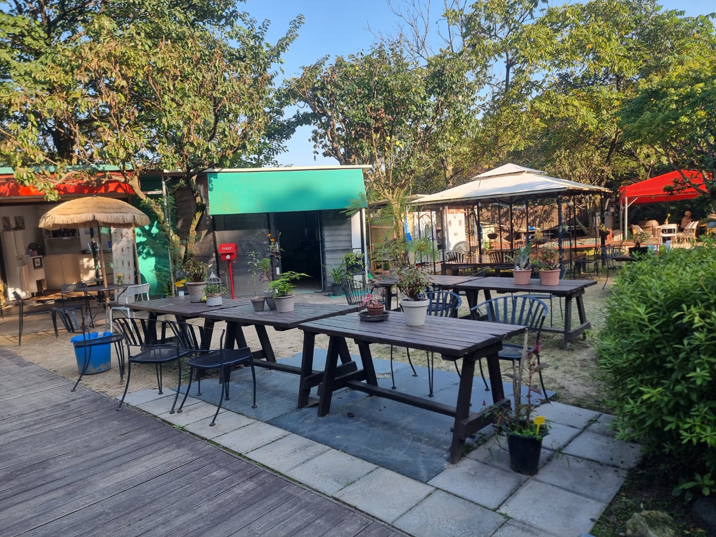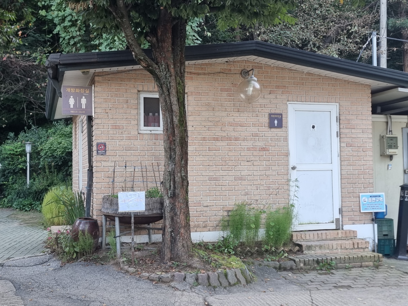 맛나게 먹 고 기분 좋으니 파라솔에 앉아 차라도 한 잔 하며 망중한을 즐기고 그것이 아니면 길 따라 산으로 갔다 오셔도 좋습니다. 고민 해결장소는 밖에 이렇게 따로 지어져 있고 다음으로는 소화도 조금 시키고 맑은 공기도 마시고 힐링 제대로 하고 왔네요. 남은 시간도 즐겁게 건행하세요.