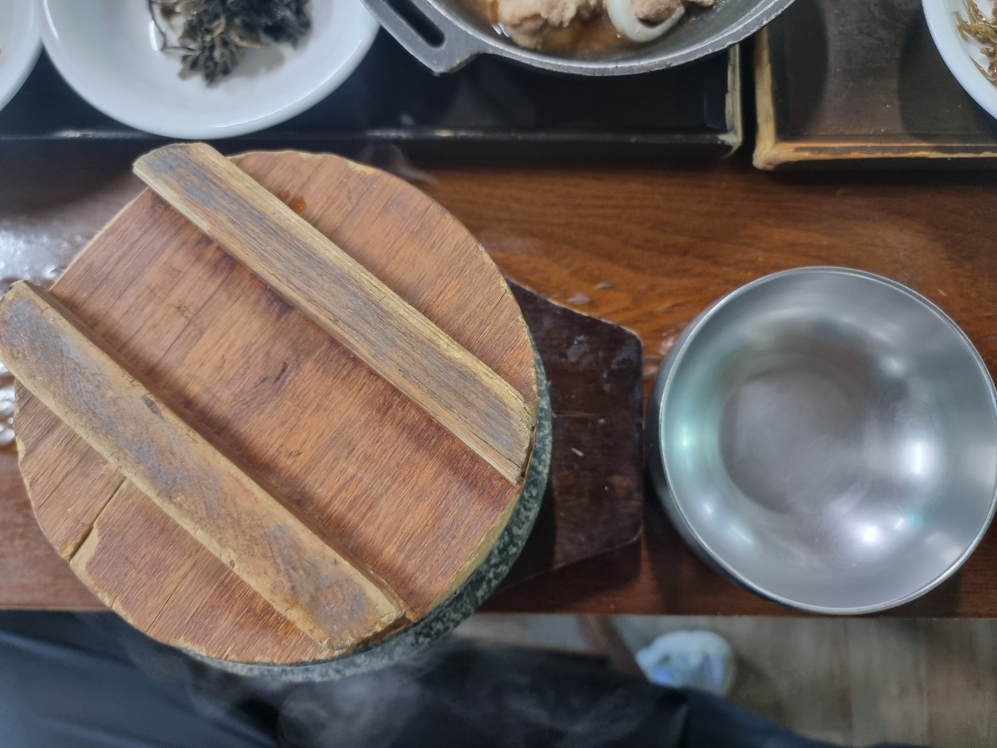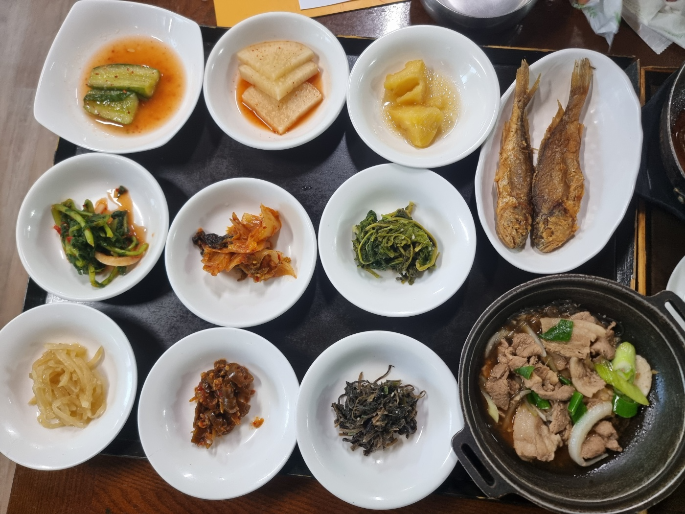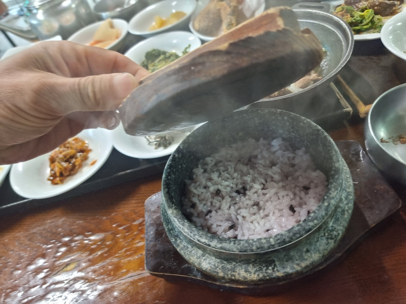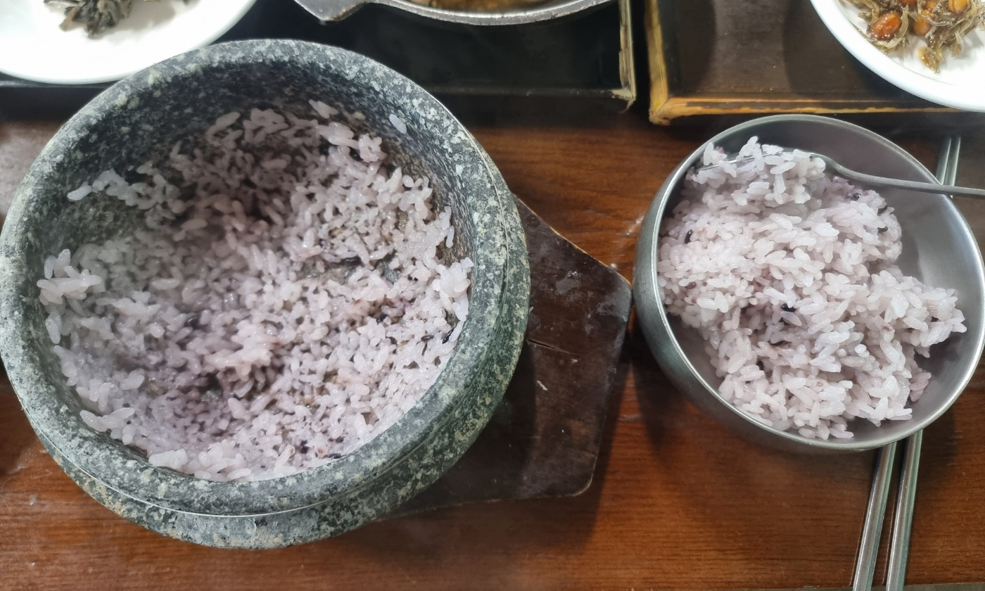 산사랑의 하나밖에 없는 단일 메뉴의 한상차림입니다. 밥은 돌솥밥이라 오른쪽에 있는 빈 그릇에 옮겨 담고 돌솥에는 물을 부어서 누룽 기를 드시면 되거든요.