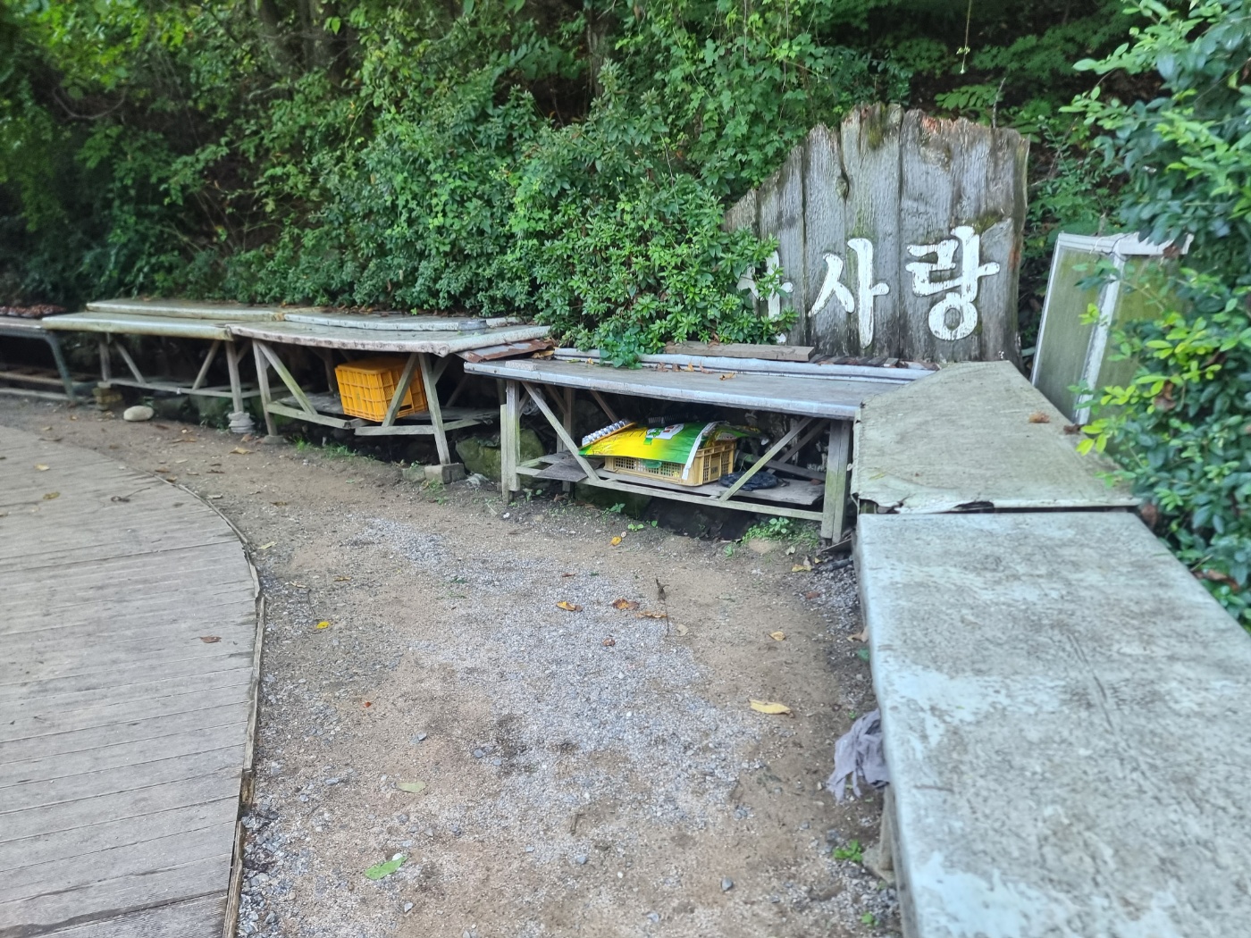 산사랑이라는 글씨에 산 앞에 세월이 지나 나무가 자라서 글씨가 바보가 되어 가네요. 테이블은 나물을 말릴 때 쓰기도 하고