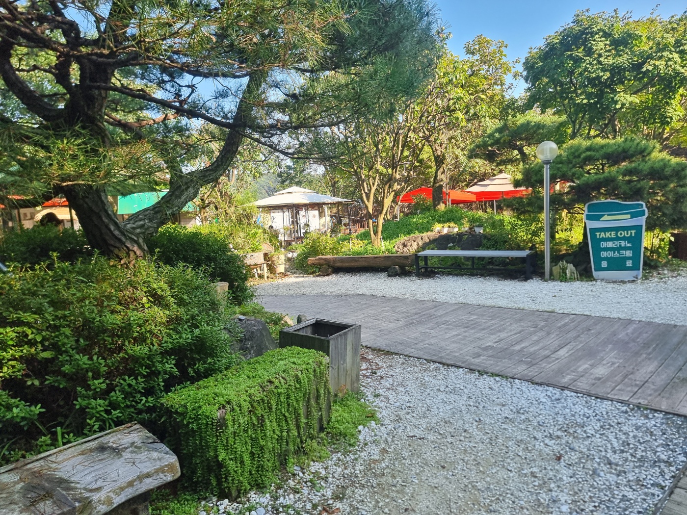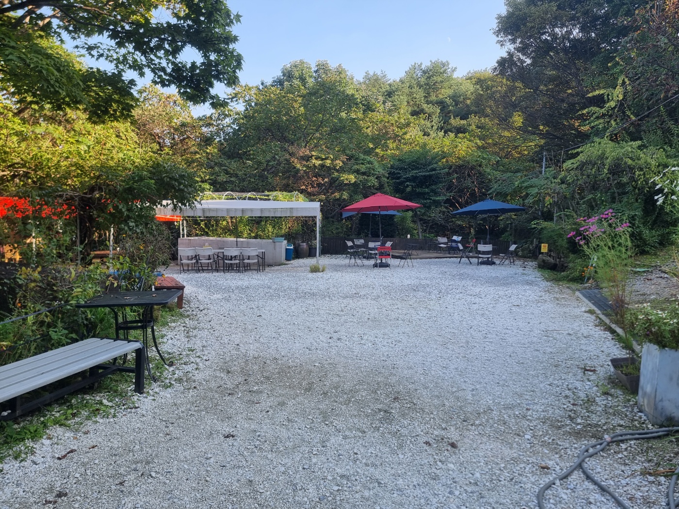 맛나게 먹 고 기분 좋으니 파라솔에 앉아 차라도 한 잔 하며 망중한을 즐기고 그것이 아니면 길 따라 산으로 갔다 오셔도 좋습니다. 고민 해결장소는 밖에 이렇게 따로 지어져 있고 다음으로는 소화도 조금 시키고 맑은 공기도 마시고 힐링 제대로 하고 왔네요. 남은 시간도 즐겁게 건행하세요.