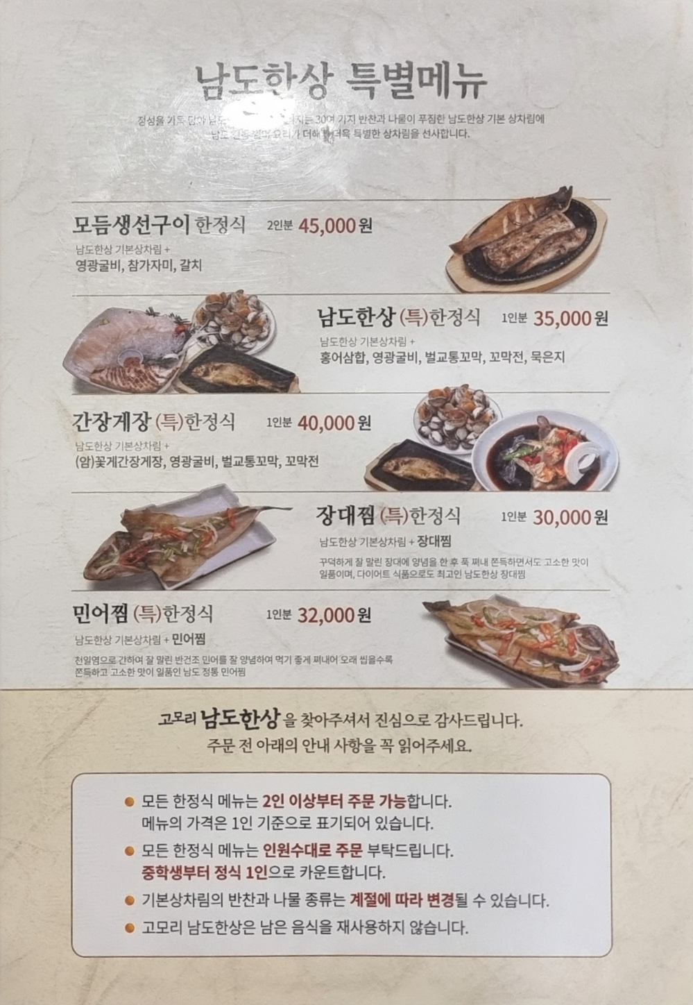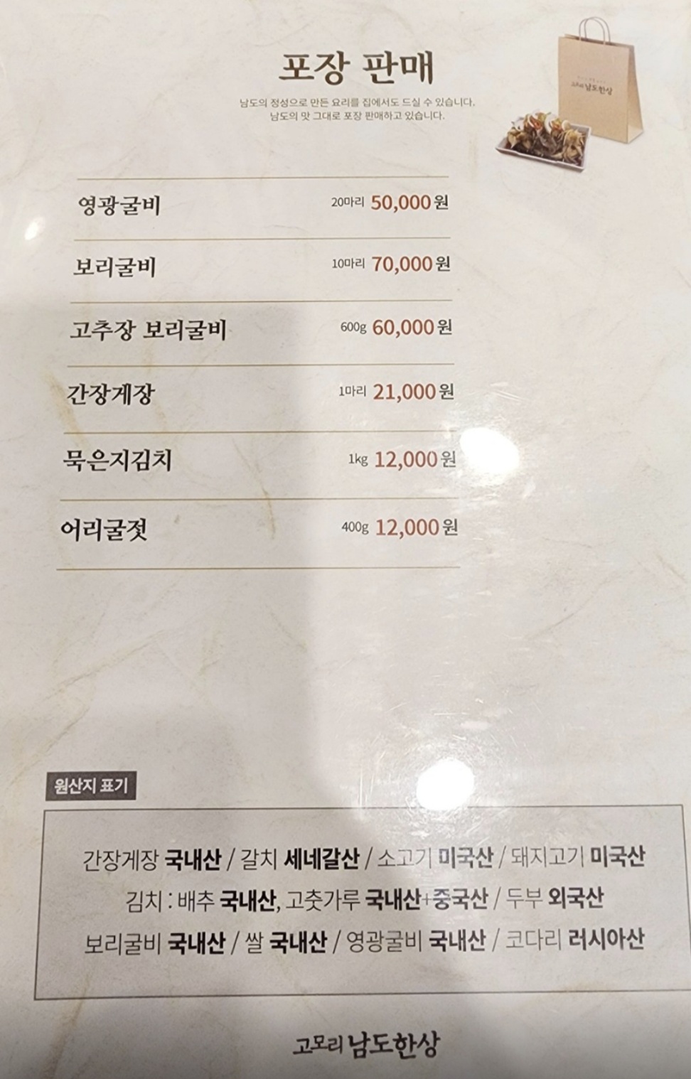 남도한상한정식 메뉴와 포장판매 메뉴도 따로 있어요.