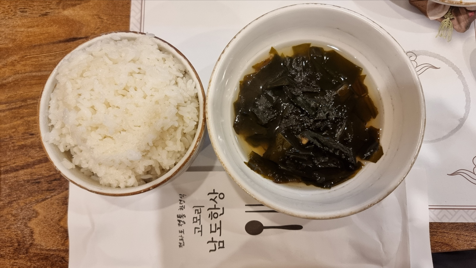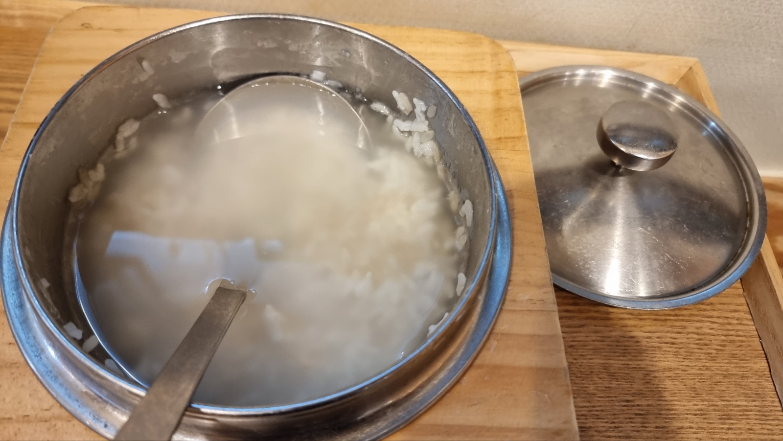 밥은 솥밥으로 나오는데 가운데 사진처럼 퍼놓고 물을 부어 누룽지를 만들고 식사를 다 드신 이후에 아까 미리 더운물 부어 놓은 누룽지를 먹어야겠지요.