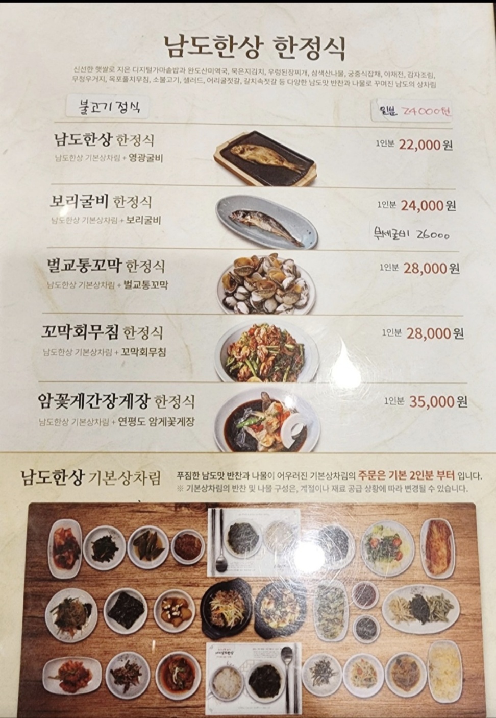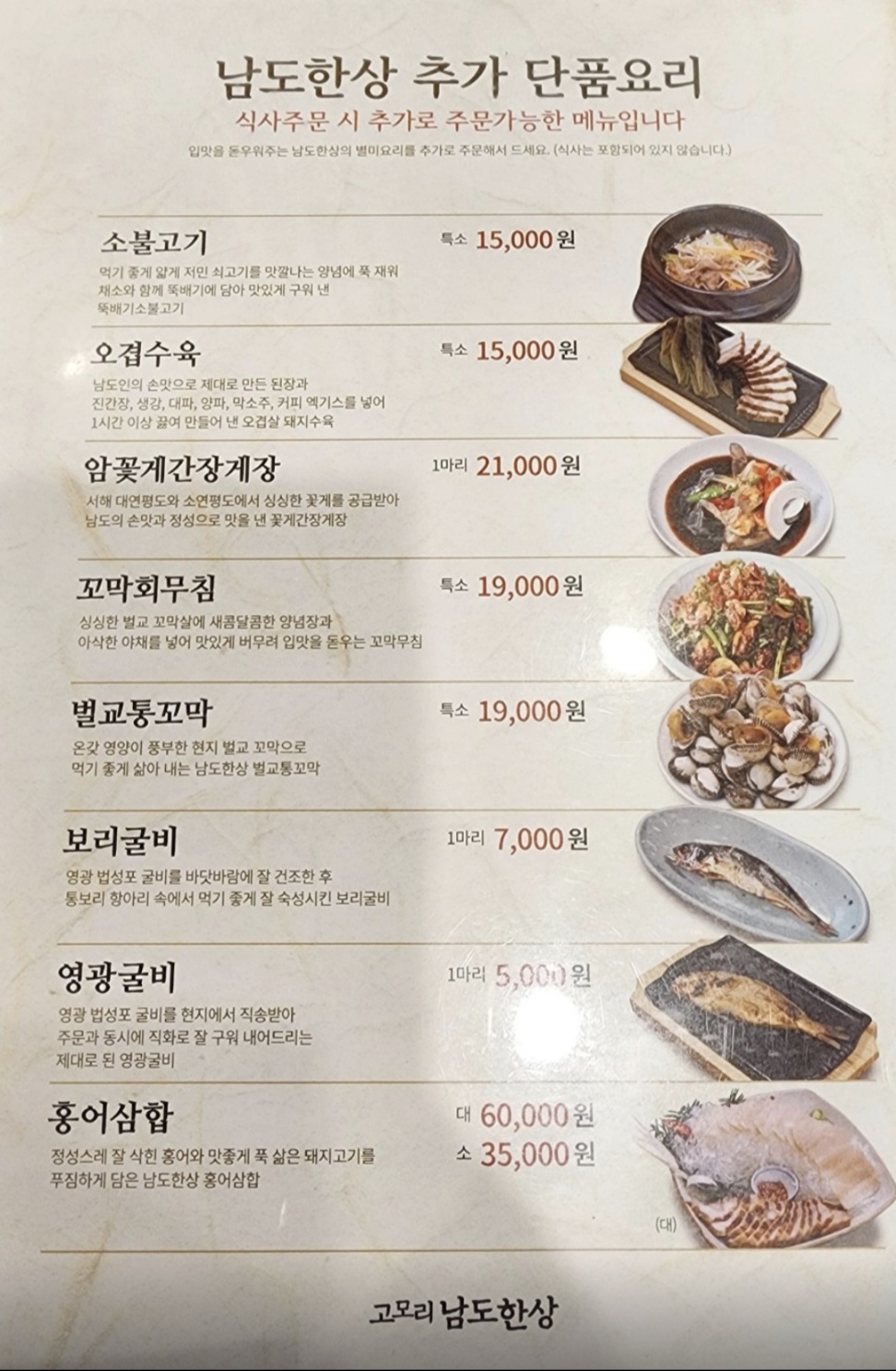 남도한상 추가 단품요리와 남도한상의 특별메뉴 표입니다.