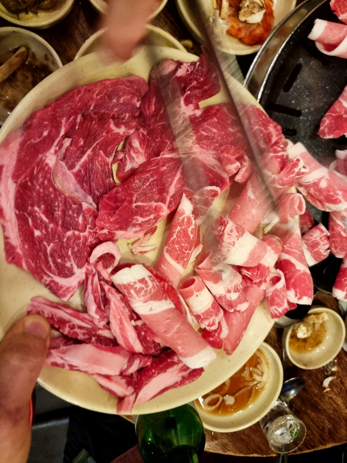 선홍빛의 소 한 마리 추가가 자연스럽게 이루어지지요. 손놀림도 바빠지고요. 먹는 템포가 쭈우욱 이어지기를 모두가 원하니 그런 거지요. 아뭍튼 기분 좋게 즐겁게 먹어요.