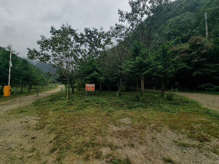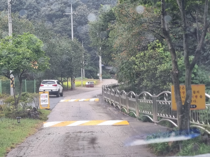 안내표지판에 따라 서행으로 들어가면 이렇게  진입금지가 있는데 이 앞에 공간에 예쁘게 주차해 놓으시면 될 것 같아요.