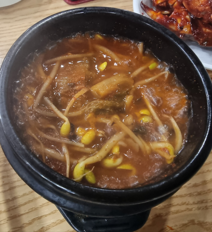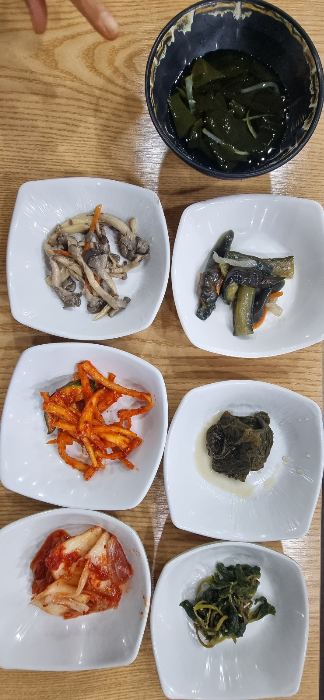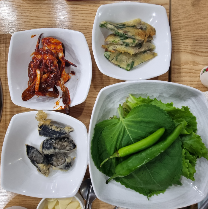 기본 찬의 모습으로 게무침, 순대튀김, 전, 상추, 깻잎, 고추입니다. 그리고........ 어느 고깃집을 가도 비슷비슷한데 이곳은 맛난 선짓국도 나오네요.