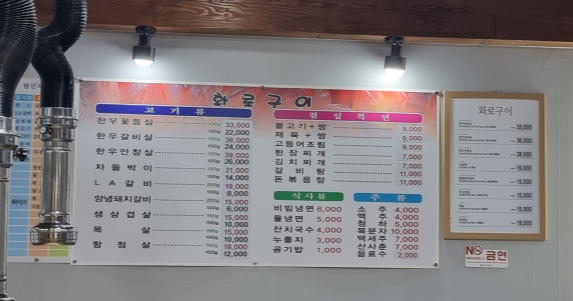 화로구이집 차림표입니다.