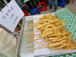 행사장에는 인삼요리체험, 인삼 깎기, 병주 만들기 등 다양한 체험행사들도 열리고 구경하다 보면 고파지는 배를 가만히 두면 안 되겠지요. 축제장 곳곳에서는 홍삼인절미,천연염색체험등 체헴프로그램도 만나 보다 보면 유혹이 너무 많은데 인삼튀김, 인삼비빔밥같이 인삼이 들어간 특별한 것도 있는데 아무래도 간식거리는 인삼 튀김이 제일 많이 나가는 것 같아요.
