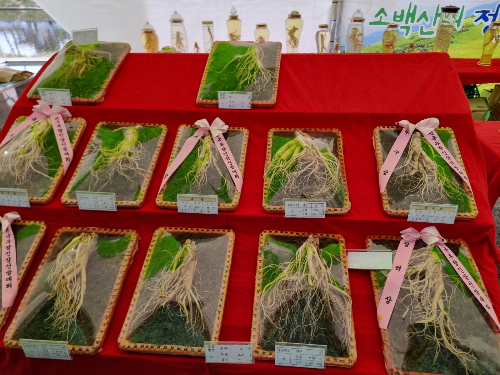 인삼의 고장답게 어마어마하게 큰 인삼을 만들어 광고를 하지요. 옆에 사란이 지나가는데 엄천 작아 보이지요. 그러니 크기가 짐작이 가겠지요. 선비의 품격, 도약하는 영주를 힘주어 강조를 하고 있어요. 그리고 전국우량인삼선발대회를 열어 그곳에서 대상과 우수상 등 선발된 우량인삼도 구경하실 수가 있지요.